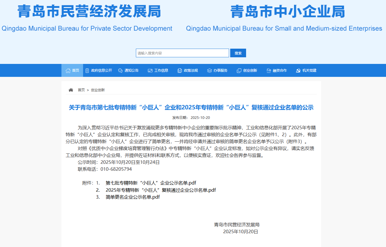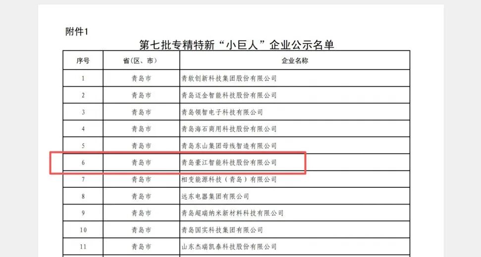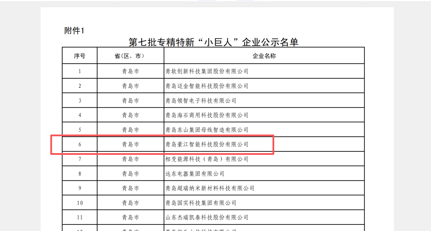 10月20日,青岛市民营经济发展局发表《关于青岛第七批专精特新“小巨人”企业和2025年专精特新“小巨人”复核通过企业名单的公示》通知,豪江智能凭借突出的综合实力成功入选,荣获专精特新“小巨人”企业称号!这一荣誉不仅是国家及主管部门对豪江智能在专业领域深耕细作、创新突破的高度认可,更是对公司多年来坚持“专业化、精细化、特色化、创新化”发展道路的有力印证!